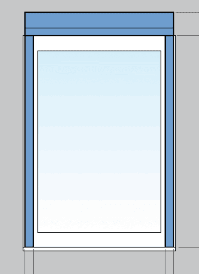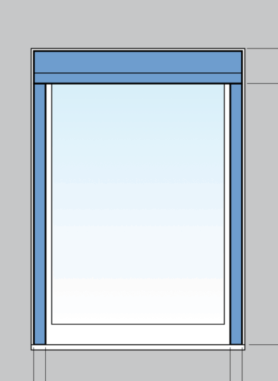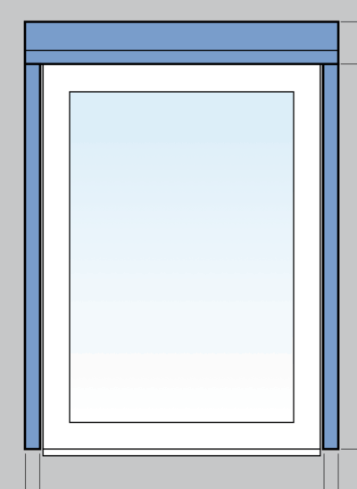 3 Montage van de kast en de geleiders op het kozijn – Bij deze manier van montage plaats je zowel de kast als de geleiders op het kozijn. We maken hierbij gebruik van HTF (platte geleiders). Haal 5mm speling af van de kleinst gemeten breedte afmeting. Vul de hoogte in dit geval in inclusief de bijbehorende kast hoogte. Montage op het kozijn wordt ook toegepast als het kozijn buiten de gevel ligt. Denk hierbij aan een dakkapel, stacaravan of chalet. Hanteer hierbij de breedte van het kozijn zonder aftrek van speling als afmeting inclusief de geleiders.