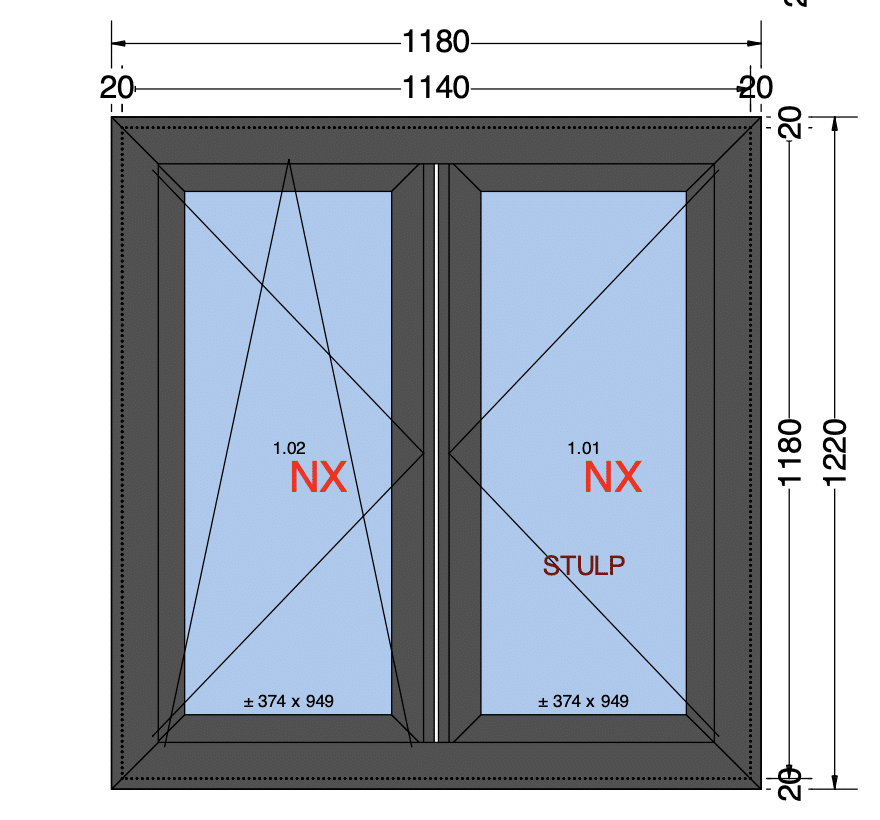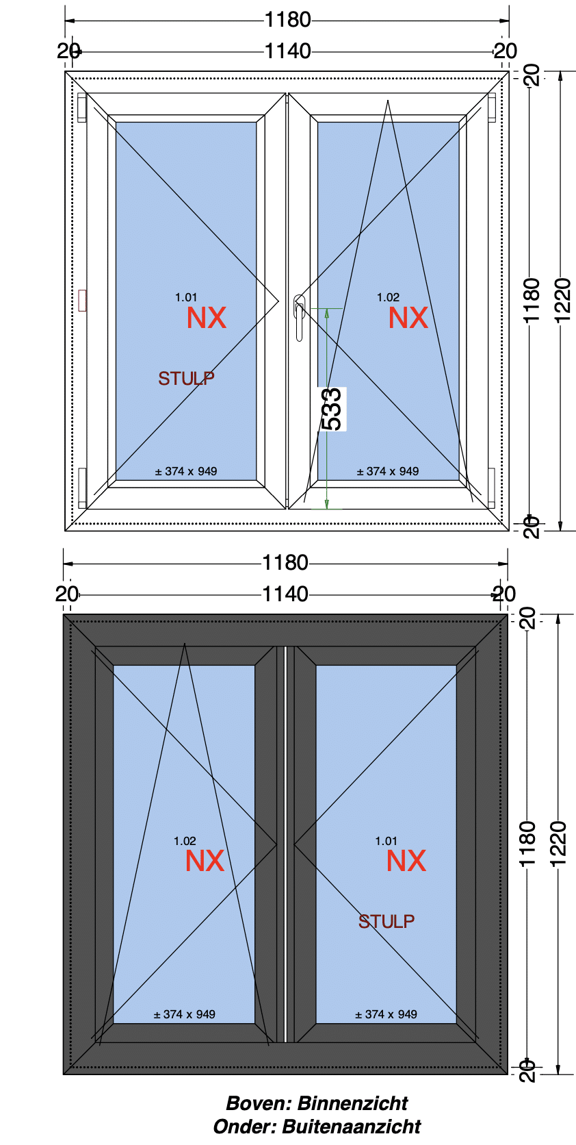 Buitenmaat: 1140mm breed x 1180mm hoog