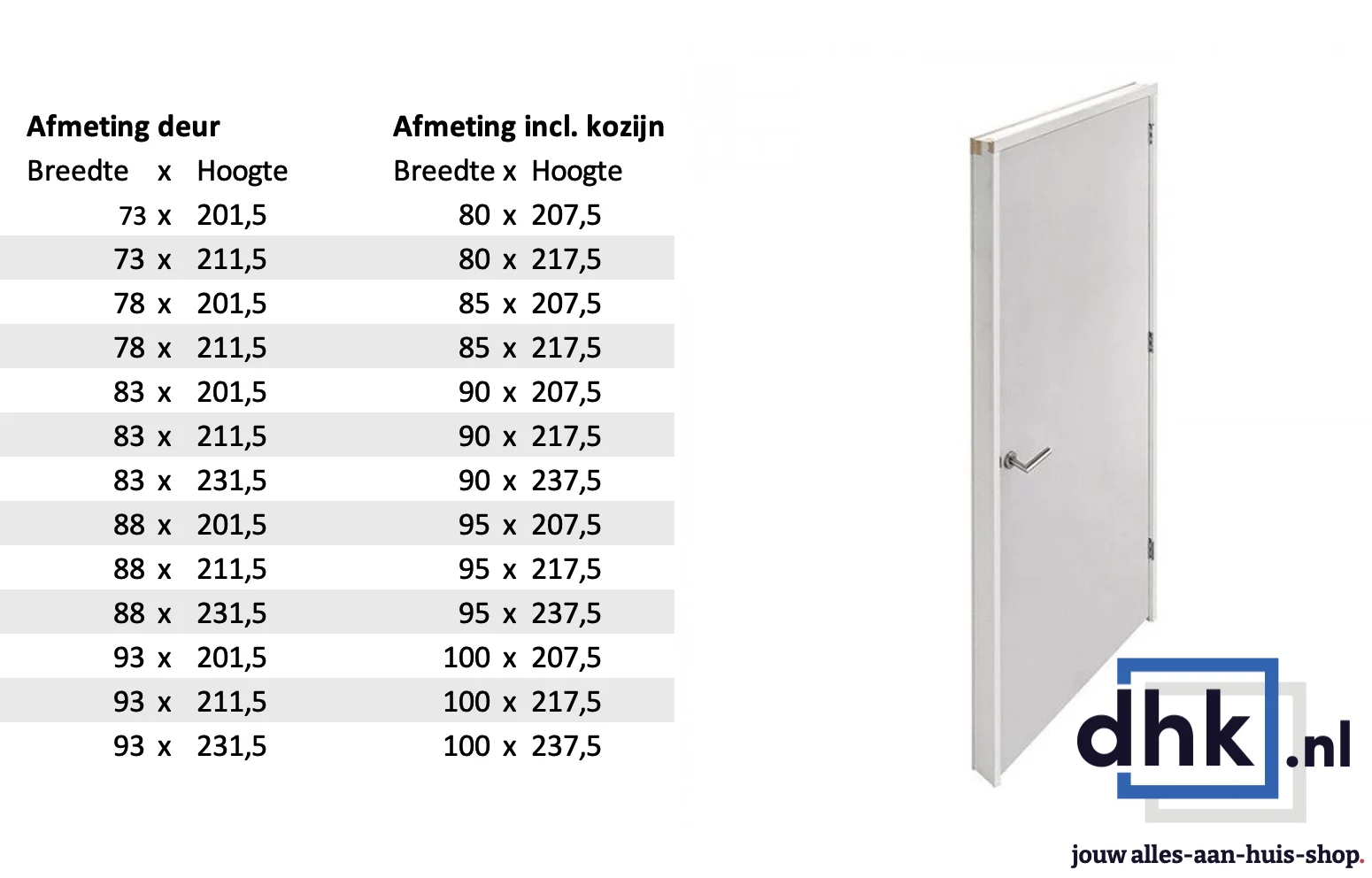 De DKC sets van Austria zijn van een zeer degelijke kwaliteit. Met deze kant-en-klare sets bespaar je een hoop tijd bij het plaatsen van nieuwe kozijnen of het renoveren ervan. De boarddeur is reeds zeer precies afgehangen. Voor de afmeting inclusief kozijn tel je 70mm in de breedte en 60mm in de hoogte op bij de deurmaat.